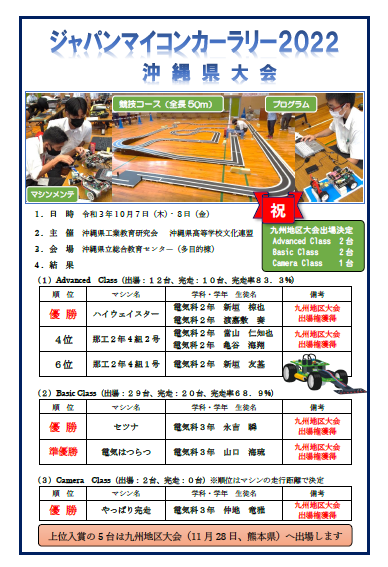 ジャパンマイコンカーラリー2022において、電気科の生徒が全部門で優勝し、九州大会出場権を獲得しました!おめでとうございます。